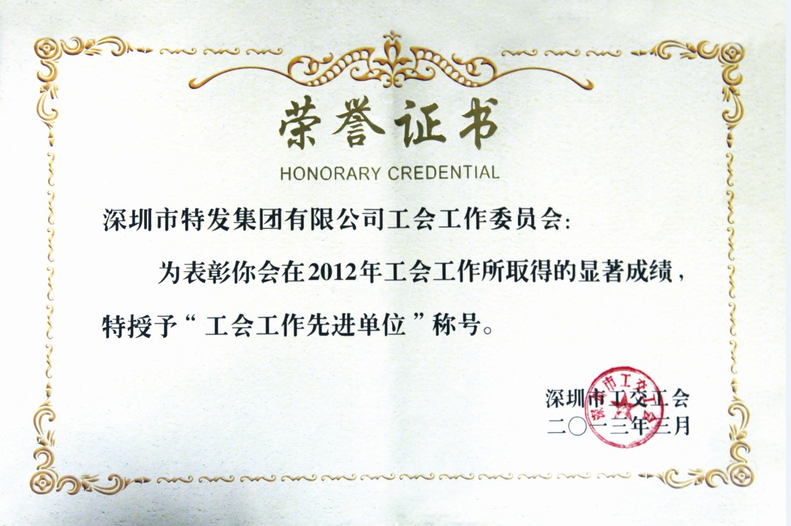2013年3月,集團(tuán)工委會獲深圳市工交工會授予2012年度“工會工作先進(jìn)單位”稱號。同時,系統(tǒng)企業(yè)特力集團(tuán)紀(jì)昌建、特發(fā)物業(yè)公司姜海忠獲市工交工會“優(yōu)秀工會工作者”稱號;特發(fā)信息李彬?qū)W、特發(fā)地產(chǎn)唐大平獲得市工交工會“優(yōu)秀職工之友”稱號;集團(tuán)總部岳紅瓊、特發(fā)黎明牛慧寧獲市工交工會“優(yōu)秀工會積極分子”稱號。
