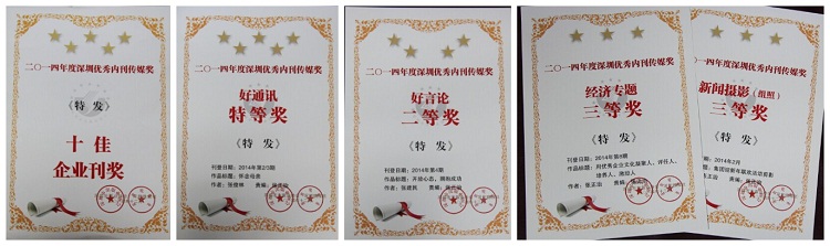 12月15日,在2014年度深圳內(nèi)刊界學(xué)習(xí)交流暨優(yōu)秀內(nèi)刊傳媒獎頒獎大會上,《特發(fā)》月刊和《華僑城》、《寶安風(fēng)》、《華安保險》、《京基》、《鴻橋》、《深業(yè)》、《城筑》、《勁嘉》、《雅昌》,被市出版業(yè)協(xié)會、深圳晚報社授予深圳市“十佳”企業(yè)刊稱號,這是《特發(fā)》月刊連續(xù)六年獲“深圳優(yōu)秀內(nèi)刊傳媒獎”最高榮譽。同時,集團張俊林董事長的《懷念母親》獲“好通訊”特等獎;張建民總經(jīng)理的《開放心態(tài),擁抱成功》獲“好言論”二等獎;張正治的《用優(yōu)秀企業(yè)文化凝聚人、評任人、培養(yǎng)人、激勵人》獲“經(jīng)濟論壇”三等獎,《集團迎新年聯(lián)歡活動剪影》獲“新聞攝影(組照)”三等獎。