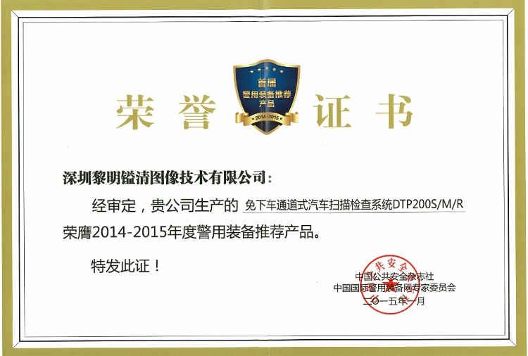發(fā)布日期:2015/2/6 11:04:36 | 瀏覽次數(shù):7067 來源:特發(fā)黎明鎰清公司 張志彬1月7日,由中國公共安全雜志社、深圳市安全防范行業(yè)協(xié)會和CPS中安網(wǎng)聯(lián)合推出的“首屆警用裝備推薦產(chǎn)品”獎在深圳隆重揭曉。特發(fā)黎明鎰清公司生產(chǎn)的“免下車通道式汽車掃描檢查系統(tǒng)DTP200S/M/R”榮膺2014-2015年度警用裝備推薦產(chǎn)品。