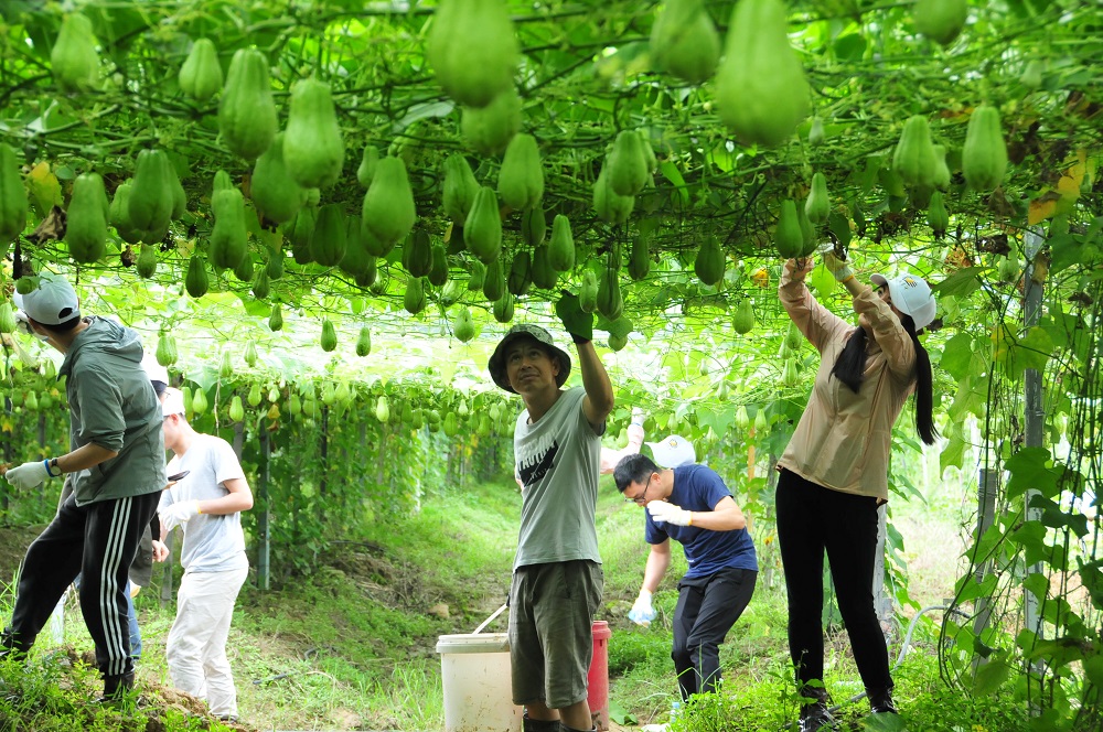 5月11日上午,團員青年一行抵達李白村,開展為期半天的“助力精準扶貧”主題團日及志愿服務活動,以實際行動助力集團脫貧攻堅。團員青年一行首先來到佛手瓜種植示范園,佛手瓜正值豐產期,長勢喜人,已形成日均產、銷超萬斤的規(guī)模。集團駐李白村工作隊隊長溫文裕欣喜地向大家介紹了佛手瓜產業(yè)園的規(guī)模及產銷情況,并帶領大家深入基地進行田間勞作體驗。除草、采摘、打葉、搬運……大家頭頂綠蔭,腳踏泥濘,認真細致,沒有半刻偷閑。隨后,在駐村工作隊江福如副隊長的帶領和介紹下,全體人員沿途參觀了集團精準扶貧項目成果——水渠、路燈、村道、李白村小學及即將建成的村民服務中心和文化廣場……在集團近3年的精準、精心幫扶下,李白村村容村貌得到了較大改善,村民生活水平不斷提高。通過零距離接觸、體驗、了解扶貧項目,團員青年們的社會責任與擔當?shù)玫綇娀?br />