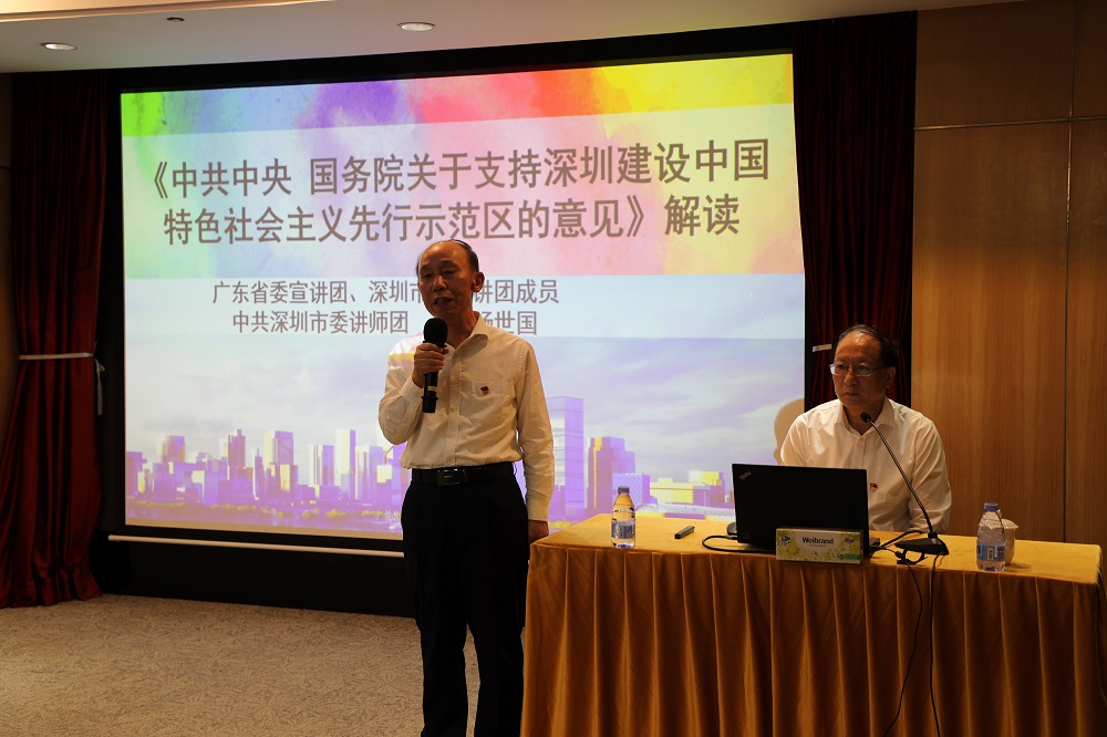 會(huì)上,中共深圳市委講師團(tuán)楊世國團(tuán)長就《意見》進(jìn)行了專題解讀。楊世國團(tuán)長從《意見》的背景和意義、主要內(nèi)容、政策創(chuàng)新點(diǎn)和亮點(diǎn)3個(gè)方面進(jìn)行了精彩講授。他以政治、現(xiàn)實(shí)和歷史三個(gè)維度,分析《意見》出臺(tái)的重大意義;從《意見》的總體要求、戰(zhàn)略路徑、保障措施3方面闡釋主要內(nèi)容;從創(chuàng)建綜合性國家科學(xué)中心、推進(jìn)綜合授權(quán)改革試點(diǎn)、用足用好經(jīng)濟(jì)特區(qū)立法權(quán)、全面深化前海改革開放、加快建設(shè)深港科技創(chuàng)新合作區(qū)、積極推進(jìn)創(chuàng)業(yè)板改革等方面講解《意見》政策創(chuàng)新點(diǎn),整個(gè)課程內(nèi)容豐富、主題鮮明、論述深刻,具有很強(qiáng)的思想性、理論性、實(shí)踐性。