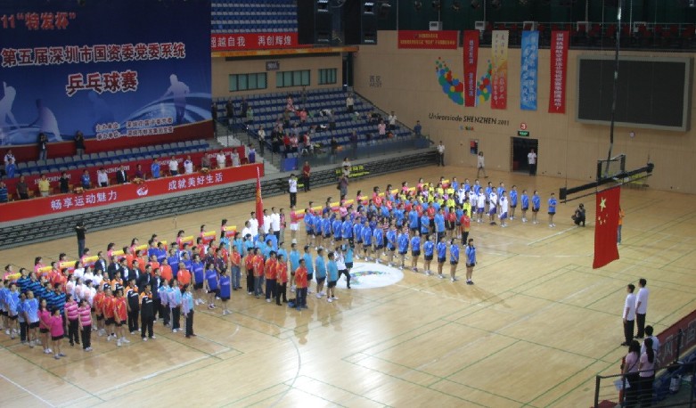 開幕式于10月29日上午8:30舉行。市國資委黨委書記柏立新,特發(fā)集團(tuán)黨委書記、董事長劉愛群、黨委副書記、總經(jīng)理施長躍,國資委黨辦主任李明、副主任張曉中、唐明通,以及國資委系統(tǒng)企業(yè)的領(lǐng)導(dǎo)出席開幕式。開幕式由集團(tuán)總經(jīng)理施長躍主持。此時的羅湖體育館一派歡快、濃烈的氛圍:主席臺正面高樹印有本次比賽徽標(biāo)和“2011‘特發(fā)杯’第五屆深圳市國資委黨委系統(tǒng)乒乓球賽”字樣的巨幅背景板,四周掛滿國資委和系統(tǒng)各企業(yè)的旗幟與祝比賽圓滿成功的條幅,以及“暢享運(yùn)動魅力,成就美好生活”、“樹競技風(fēng)尚,展國企風(fēng)采”等標(biāo)語,各單位啦啦隊和觀眾坐滿看臺。伴隨著熱烈歡快的運(yùn)動員進(jìn)行曲,來自國資委系統(tǒng)21家單位的22支代表隊,在美麗端莊的引導(dǎo)員帶領(lǐng)下,隨著高舉國資委旗幟的旗手、護(hù)旗手依次入場,隊員們意氣風(fēng)發(fā),精神飽滿,步伐矯健,隊列整齊。在全體起立奏唱國歌、莊嚴(yán)的升國旗儀式后,集團(tuán)董事長劉愛群和國資委黨委書記柏立新分別代表承辦方和組委會先后致辭。